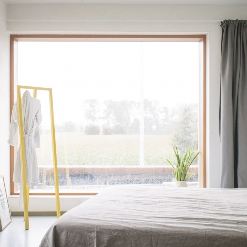 Prolomený roh domu je terasou, bonusem ložnice majitelů. I on prohlubuje kontakt domu a krajiny „za humny“. Otvory jsou vyplněny dřevěnými okny. Některé z nich jsou fixní, jiné posuvné – nerušený výhled, nerušená komunikace.
