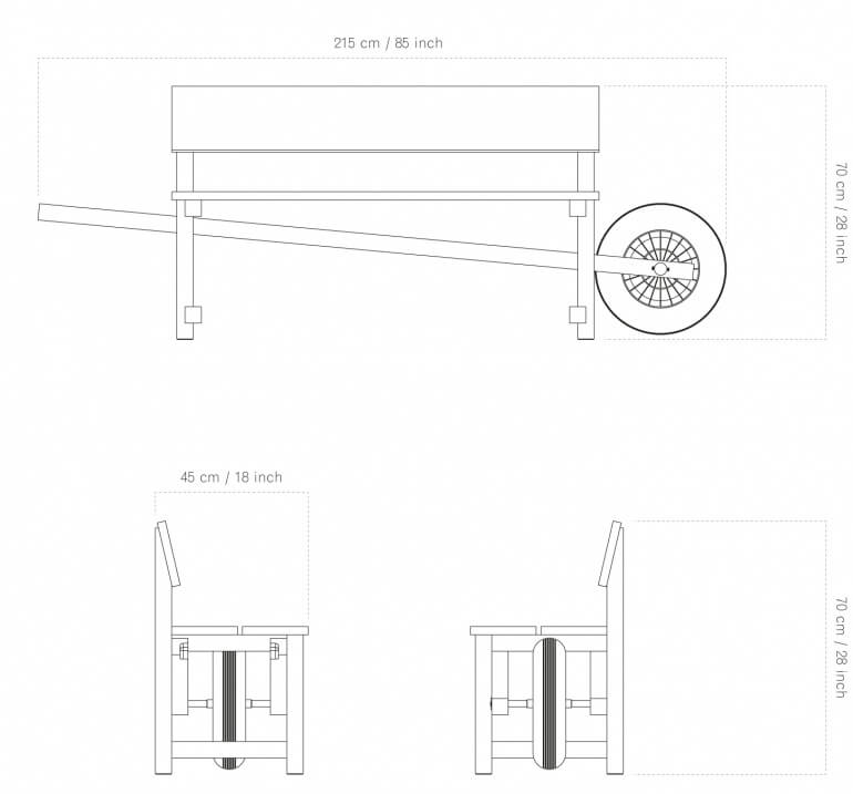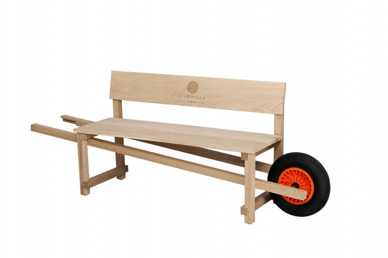 Další vychytávkou a designovým kouskem z dílny Weltevree je mobilní lavice. Jedná se vlastně jednoduše pořádný kus dubového dřeva s "vestavěným" kolem od trakaře. Překvapivá kombinace dobře známých prvků umocňuje potřebu jeho aktivního venkovního užití.