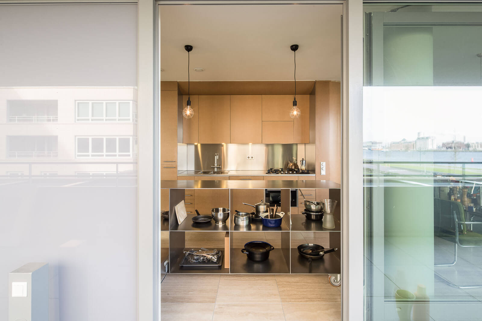 V obývacím pokoji není betonová zeď celistvá. Je ozvláštněna 5 obdélníkovými "otvory". Tři z nich, jsou opravdové průhledy, vedoucí do chodby. Nejen, že sjednocují vnitřní prostory, zajišťují také přirozený pohyb vzduchu a světla. Další dva průzory skrývají koupelnu a jsou tedy kryty zrcadly. Estetický vzhled tedy doplňuje funkčnost, která mimo jiné prostor opticky zvětšuje. Dostatečné prosvětlení kuchyně zase zajišťují velká francouzská okna, vedoucí na terásku. Přidává se i světlá podlaha a bílé zdi.