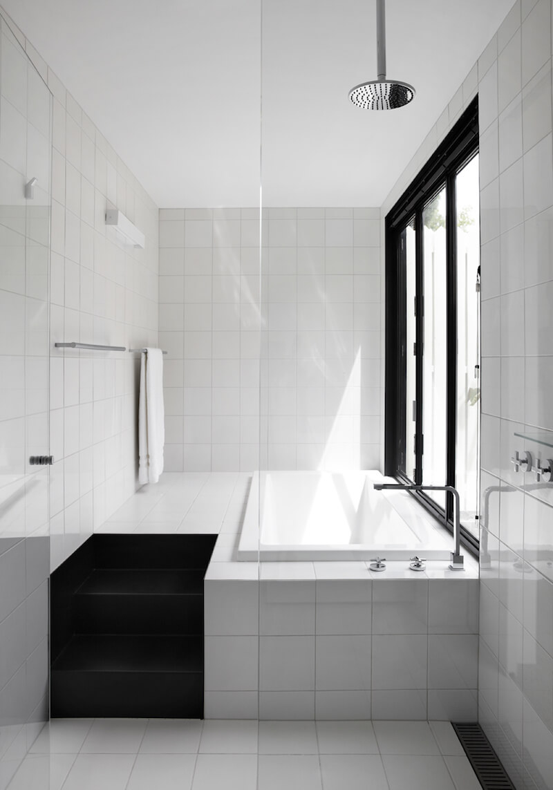 Koupelna se zapuštěnou vanou je díky bílému keramickému obkladu plná světla.