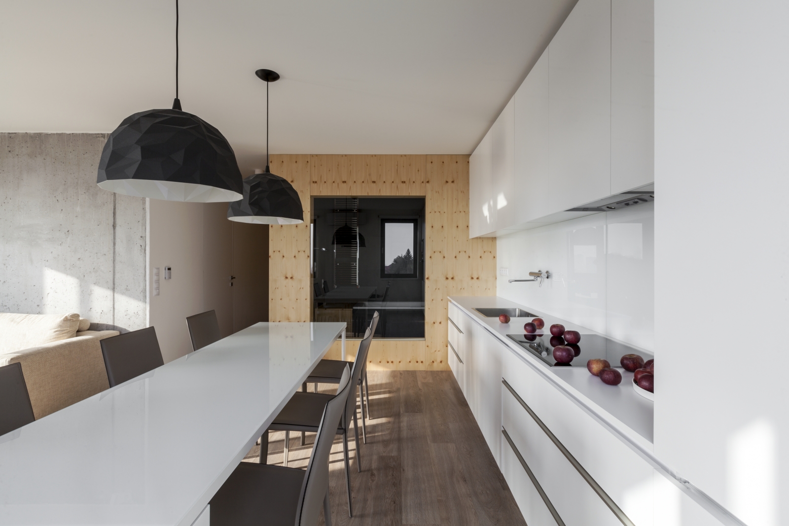 Ustředím celého bytu je obývací prostor, který je symbiózou několika výrazných prvků. Interiér je patřičně osvětlen dvěma okny, která zároveň nabízí velkolepý výhled do okolí. Nejzásadnější je kubus obsahující hygienické prostory, obložený borovicovou dýhou, do jehož středu je zasazeno okno, propojující koupelnu s kuchyňským prostorem. Měkkost a živelnost textury borovicového dřeva je pak z jedné strany zvýrazněna hladkou bílou kuchyňskou linkou, z druhé strany roztříštěna obnaženou betonovou stěnou. Prostor kuchyně je sjednocen pomocí bílých lesklých ploch kuchyňské linky a velkého jídelního stolu, umístěného ve středu kuchyně. V kontrastu je pak zvolena barva i povrch svítidel nad stolem nebo matný tmavě šedý povrch interiéru koupelny.