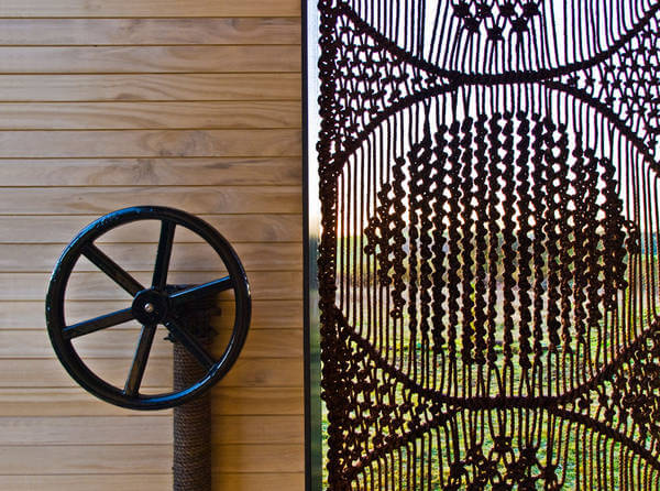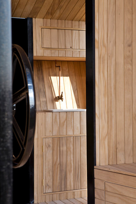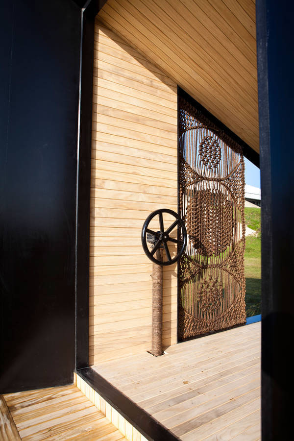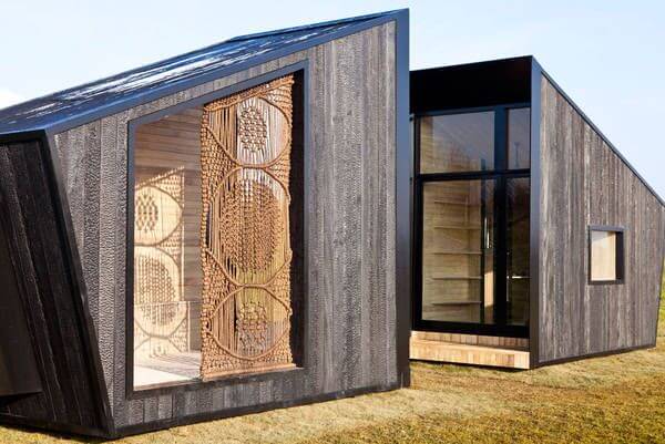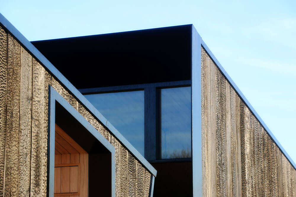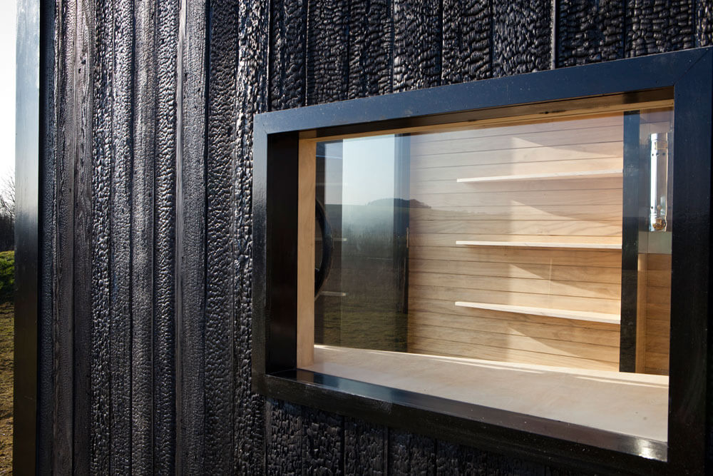 Výběr materiálů byl důležitou součástí návrhu. Konstrukce se skládá z ocelového rámu a ohořelého dřeva, které je touto úpravou vysoce odolné vůči povětrnostním podmínkám. Zároveň je přátelské k životnímu prostředí.