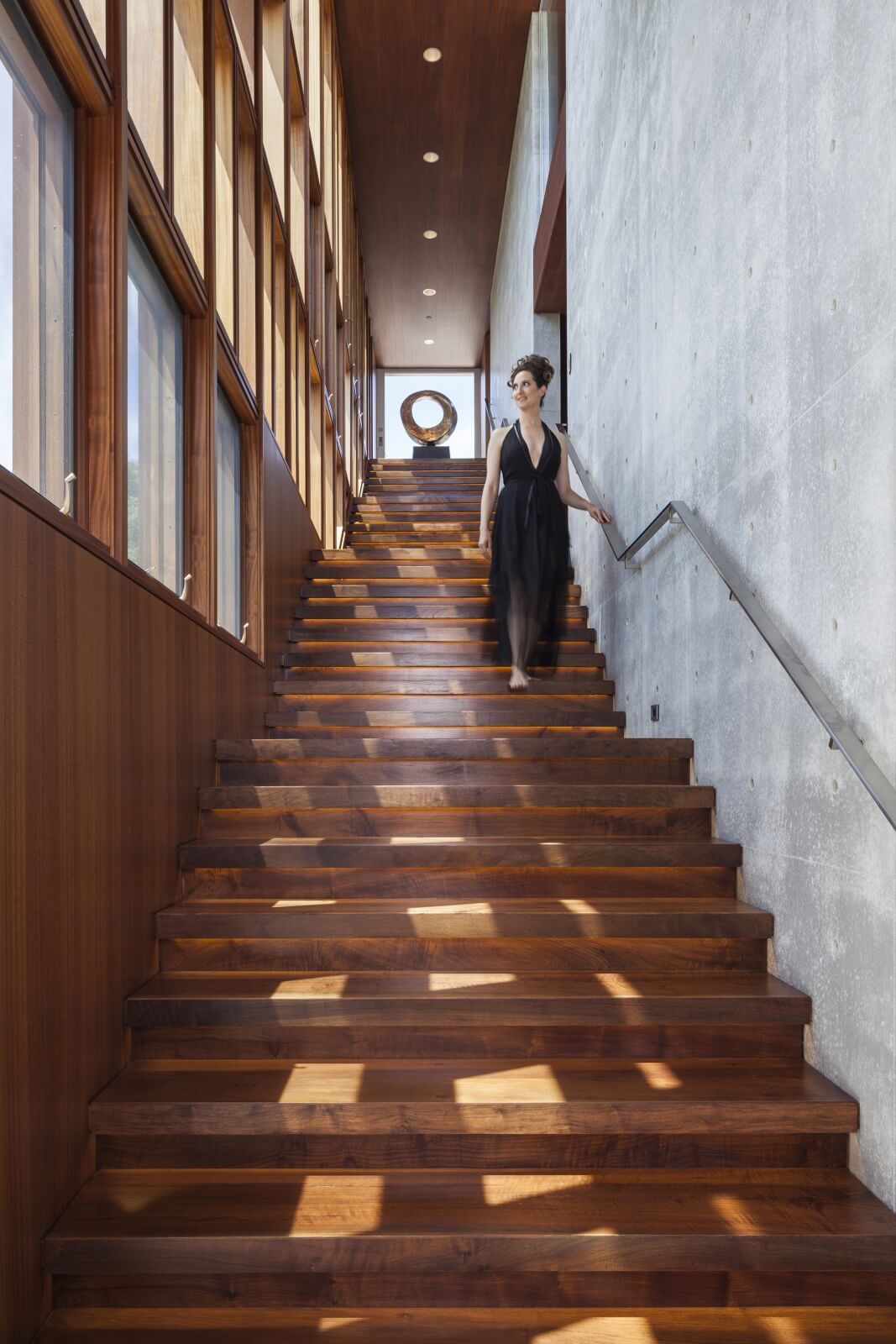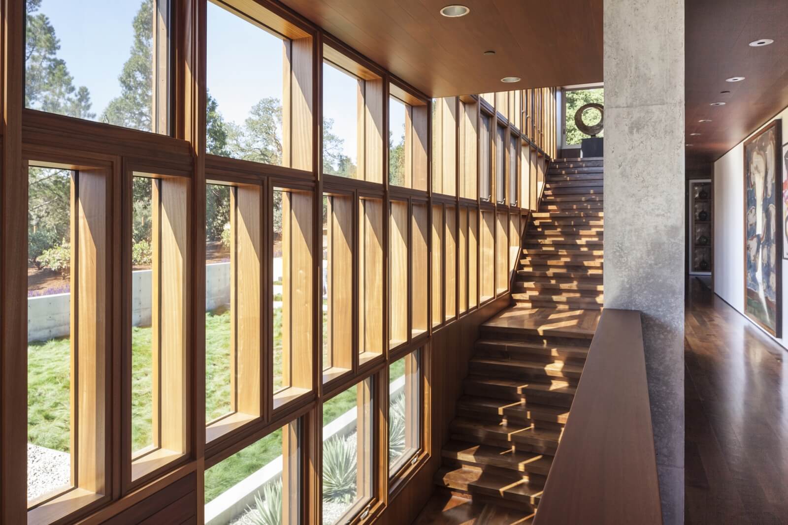 Schodiště je ozvláštněno rytmickou třípatrovou prosklenou zdí, která zároveň tvoří jeden okraj soukromého nádvoří na jižní straně domu.