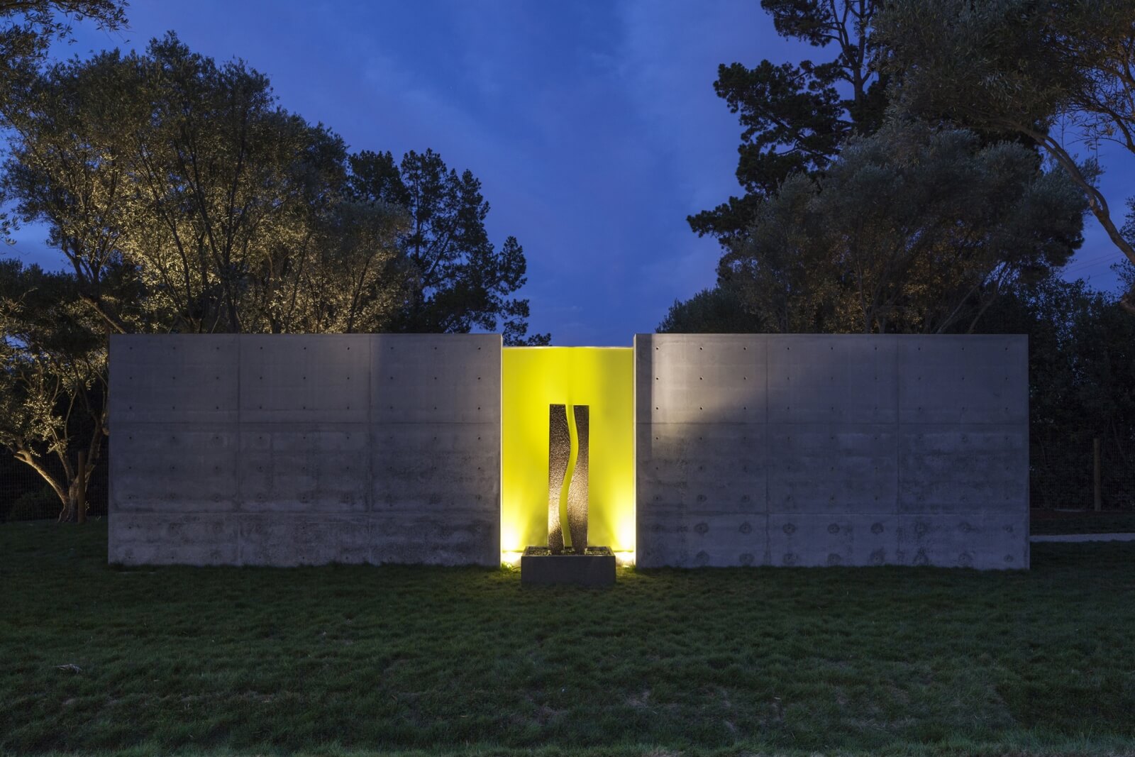 Výsledný design, který navrhla firma Swatt | Miers Architects, je založen na tvaru písmene "L" a odvíjí se od třípatrové betonové zdi, která vyčnívá z krajiny a rámuje venkovní prostory na obou stranách domu. Hlavní veřejné místnosti jsou umístěny na nižší úrovni, zatímco ložnice a domácí kancelář se nachází ve vyšších patrech. Kratší křídlo obsahuje další kancelář, samostatně stojící garáž a domek pro hosty.