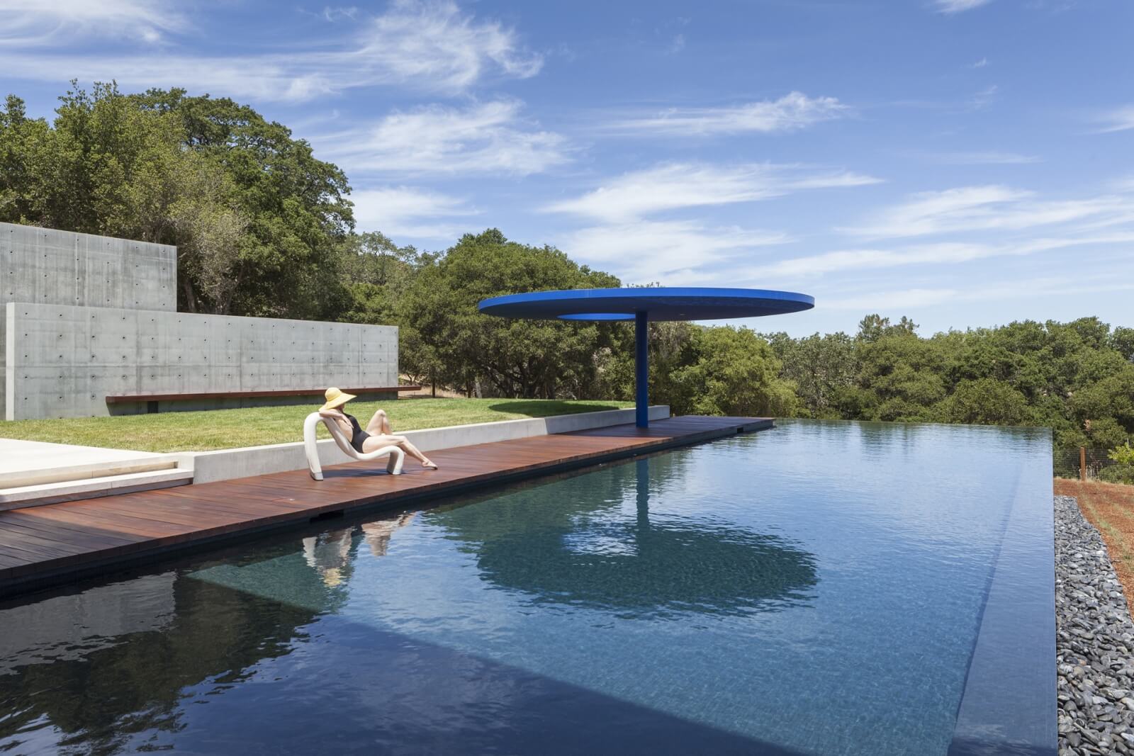 Venkovní prostory se dělí na dvě hlavní části: soukromou zahradu na jižní straně a společenskou terasu určenou pro zábavu, s krásnými výhledy na sever. Kolmo k domu je umístěn 22 m dlouhý plavecký bazén, lemován dřevěným ochozem a obdélníkovým trávníkem. Společně definují západní okraj bezprostřední krajiny s přesnou geometrií, zatímco mírně se svažující původní traviny vytvářejí klidné a ničím nerušené prostředí, přilehlé ke vstupu.