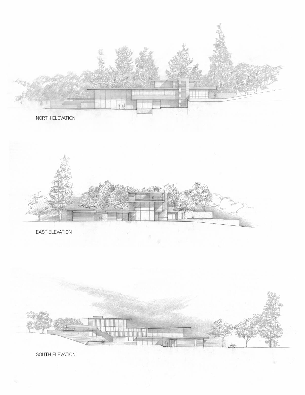 Architektonický jazyk zde velmi promlouvá jednoduše, téměř elementárně. Horizontální dřevěné desky tvoří podlahy i střechy a jsou v kontrastu k vertikálnímu betonovému jádru. Navíc jsou vyplněny obrovskými okny pro maximalizaci výhledů.