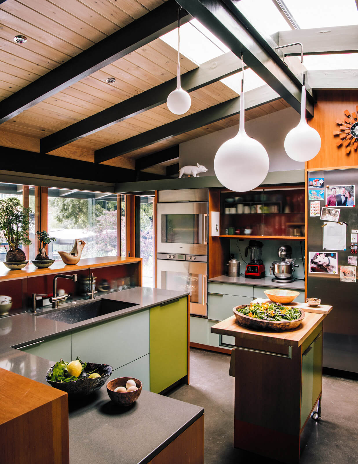 Kuchyň je plná barev a díky střešním oknům je dobře osvětlená.