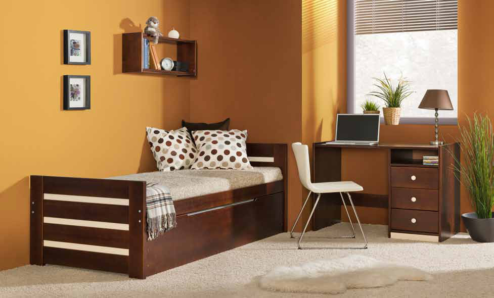 Sestavu dřevěného nábytku pro studentský pokoj tvoří kvalitní jednolůžková postel s přistýlkou a vyklápěcím úložným prostorem. Díky tomu může v pokoji přespat i návštěva. Psací stůl s dostatkem volného místa pro psaní obsahuje tři šuplíky a jeden regál pro uložení osobních věcí nebo školních potřeb. Závěsná police obdelníkového tvaru studentovi dovoluje přehledné vyskládání knih nebo učebnic. Dohromady vzniká harmonicky působící prostor, kde je snadné získat zapálení pro školní aktivity. Nábytek je dostupný v mnoha variantách barevného moření.