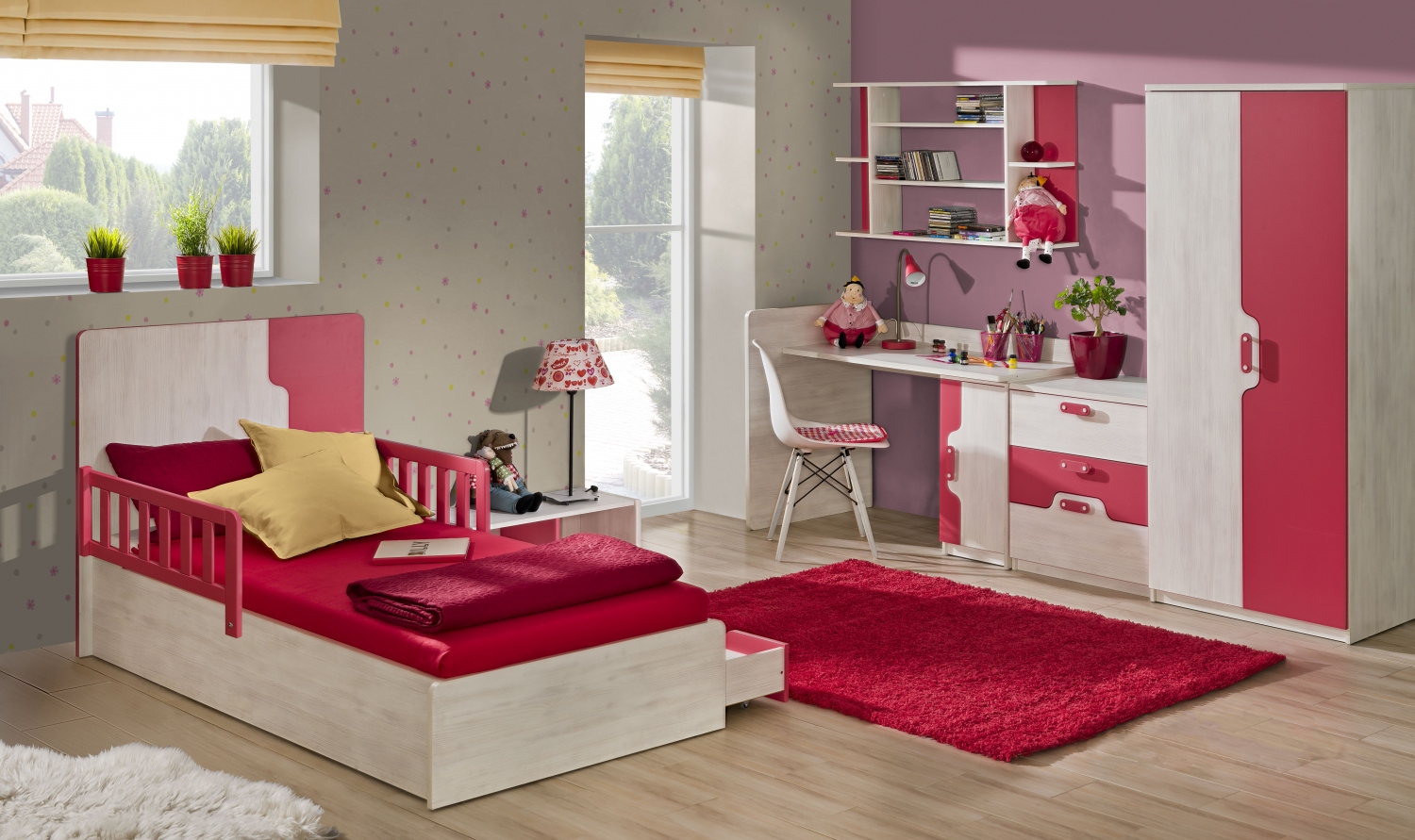 Její součástí je dětská šatní skříň vybavená policemi, 2 bezpečnostní zábrany k posteli a multifunkční rostoucí postýlka, kterou můžete později rozložit na dětskou postel, psací stůl s kontejnerem, šuplíkovou komodu a police. Dětský nábytek nabízíme ve dvou variantách barevného provedení.