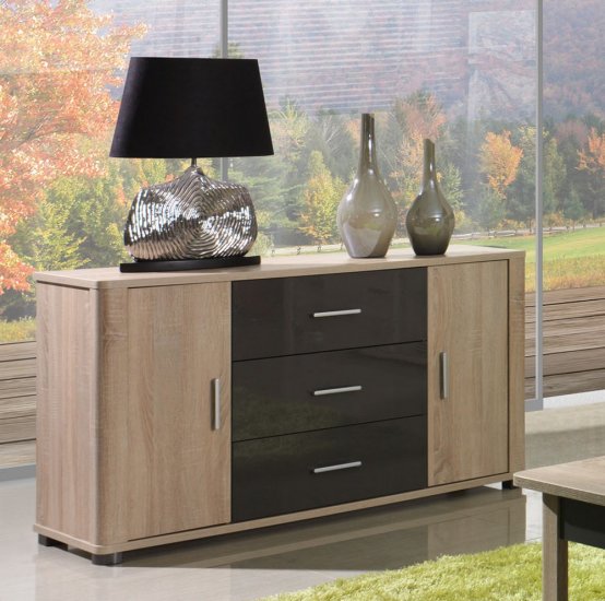 Kombinovaná komoda v moderním dvoubarevném designu je tvořena třemi šuplíky, které můžete využít pro své osobní věci nebo jako prádelník. Po stranách šuplíků jsou úložné skříňky, které najdou jistě své uplatnění v každé domácnosti.