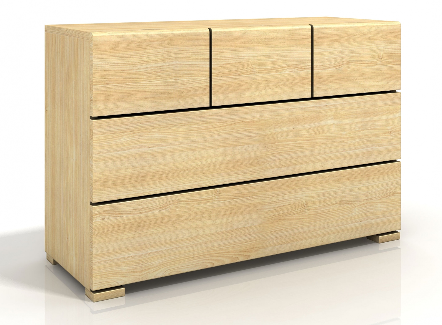 Komoda je rozčleněna do pěti úložných prostor ve formě zásuvek. Ve spodní části jsou dvě velké a vrchní sektor je rozčleněn do tří malých. Ty mají úchyty zahloubené do vrchní desky, aby nerušily celkový dojem z čelního pohledu. Komoda je vyrobena z borovicového masivu, což je surovina, příjemná na omak, ale zároveň se vyznačující pevností a odolností proti poškození. Výrobek lze jednoduše a rychle smontovat, takže vám bude během pár okamžiků k dispozici.