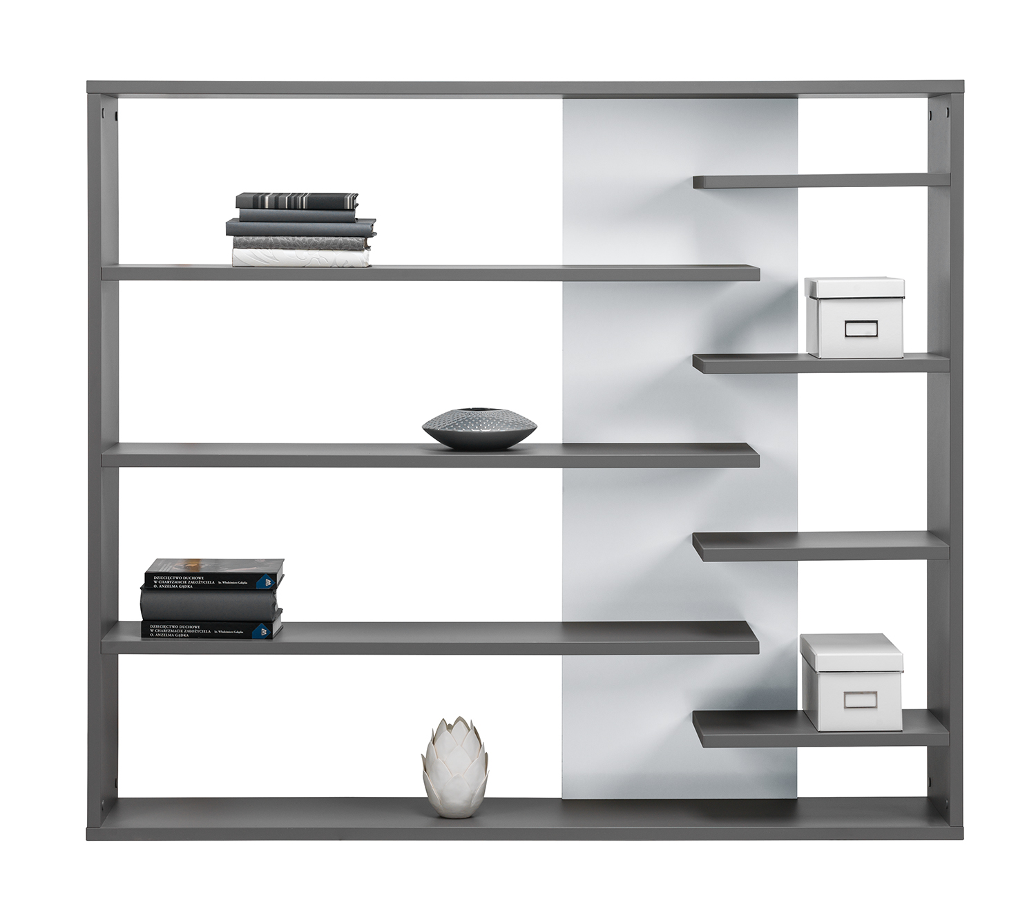 Regál s asymetricky rozmístěnými policemi je ideální pro umístění do obývacího i studentského pokoje. Vzhledem k jeho univerzálnosti je však možné jej využívat takřka kdekoliv. Pro dosažení patřičné stability, žádoucí pevnosti a dostatečné odolnosti vůči mechanickému poškození bylo na výrobu použito spolehlivé lamino, mezi jehož další výhody patří také hladký povrch nenáročný na údržbu.