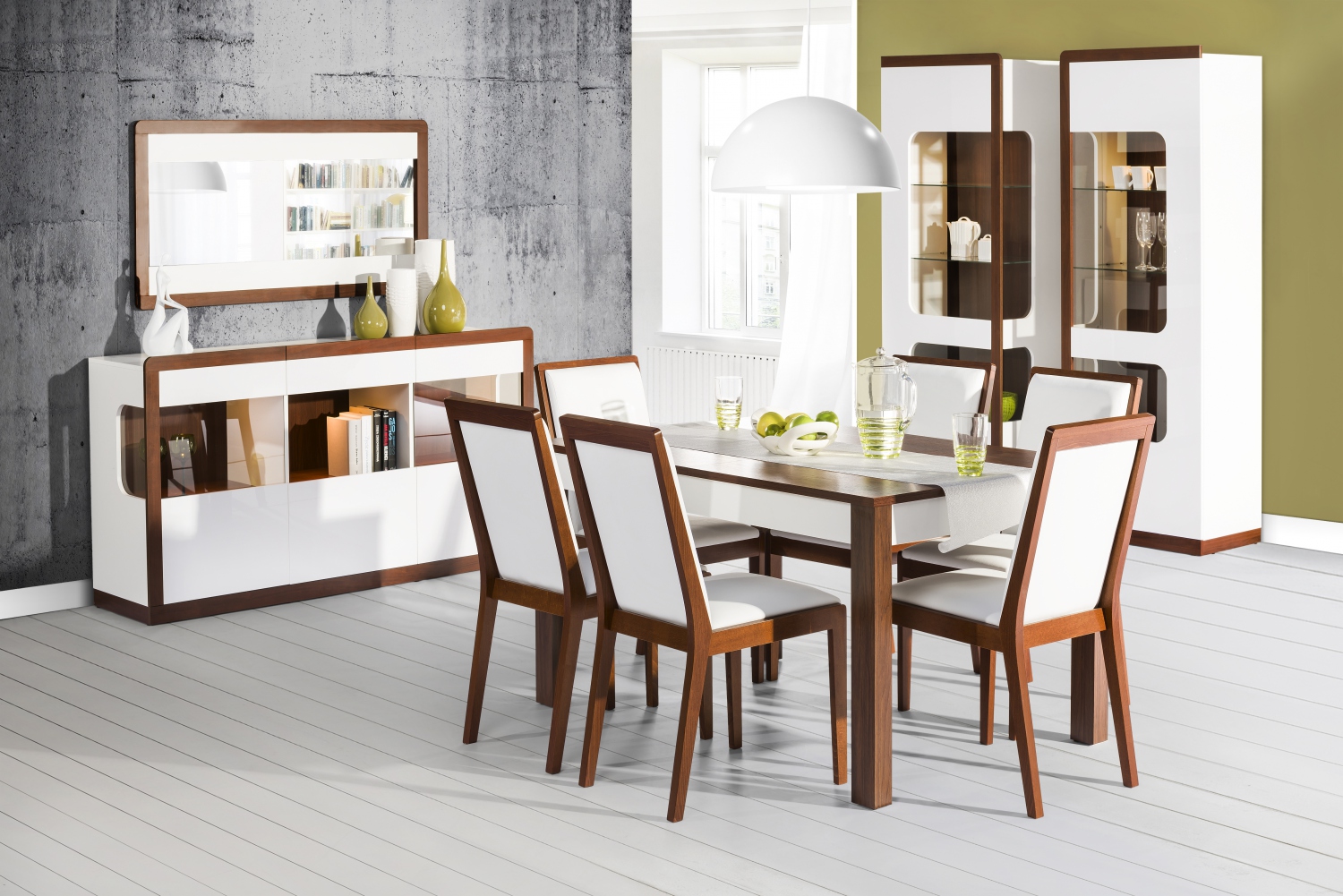 Nepřehlédnutelným prvkem celé sestavy je rozkládací stůl z LTD se 6 polstrovanými židlemi z bukového masivu. Stůl lze prodloužit pomocí vkladek o šířce 25 cm. Součástí soupravy jsou dvě vkladky. Polstrování židlí je volitelné. Lze si vybrat mezi eko kůží a potahovou látkou. Celá jídelna se dodává v barevné kombinaci bílý lesk a ořech.