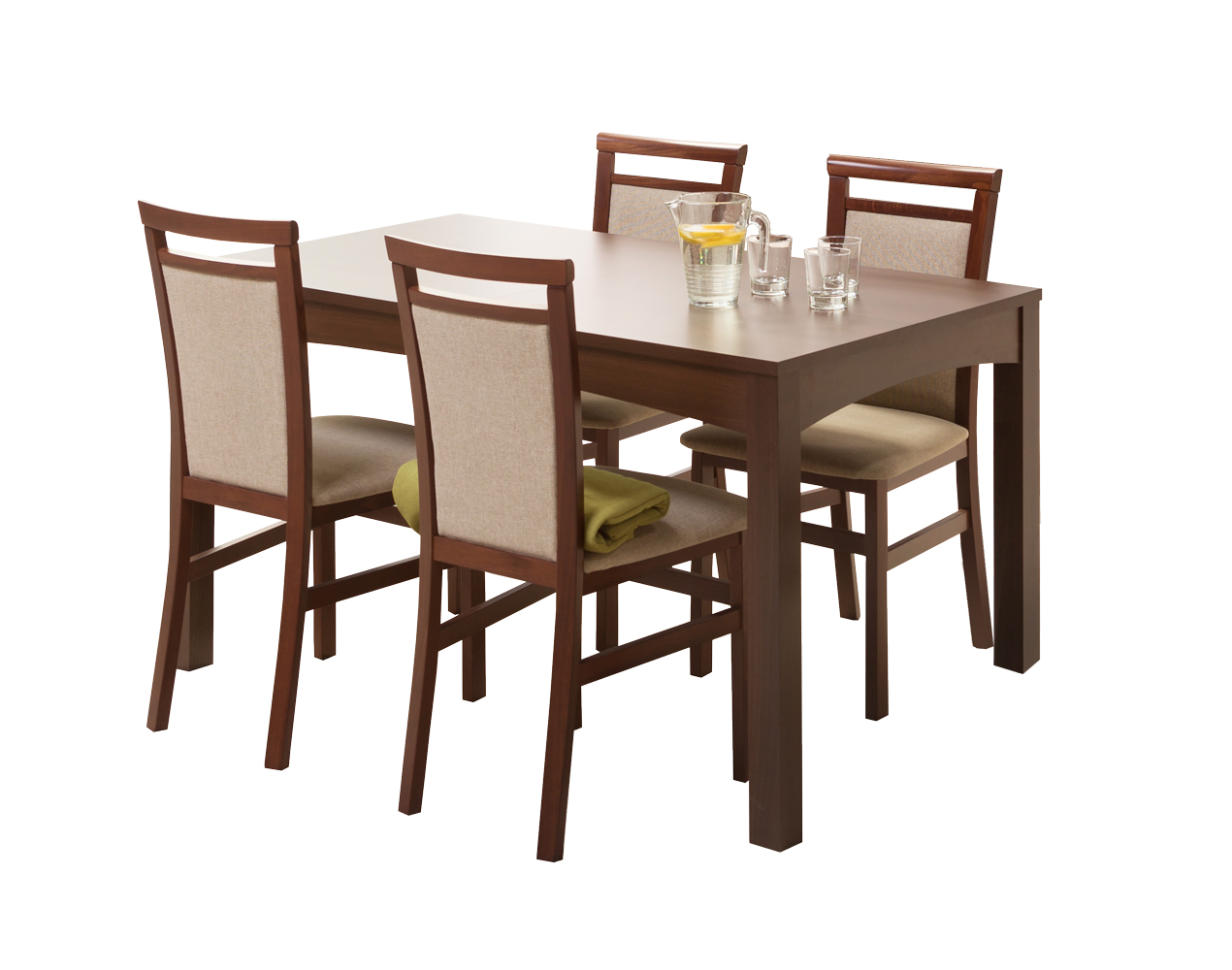 Jídelní stůl je vyroben z lehce udržovatelného a omyvatelného LTD materiálu, který poskytuje i potřebnou stabilitu. Oproti tomu židle jsou z masivu buku, který jim poskytuje vysokou pevnost a nosnost. Provedení si můžete vybrat ze dvou odstínů - třešeň malaga nebo akácie královská. Opěradlo i sedák jsou opatřeny příjemnou režnou látkou.