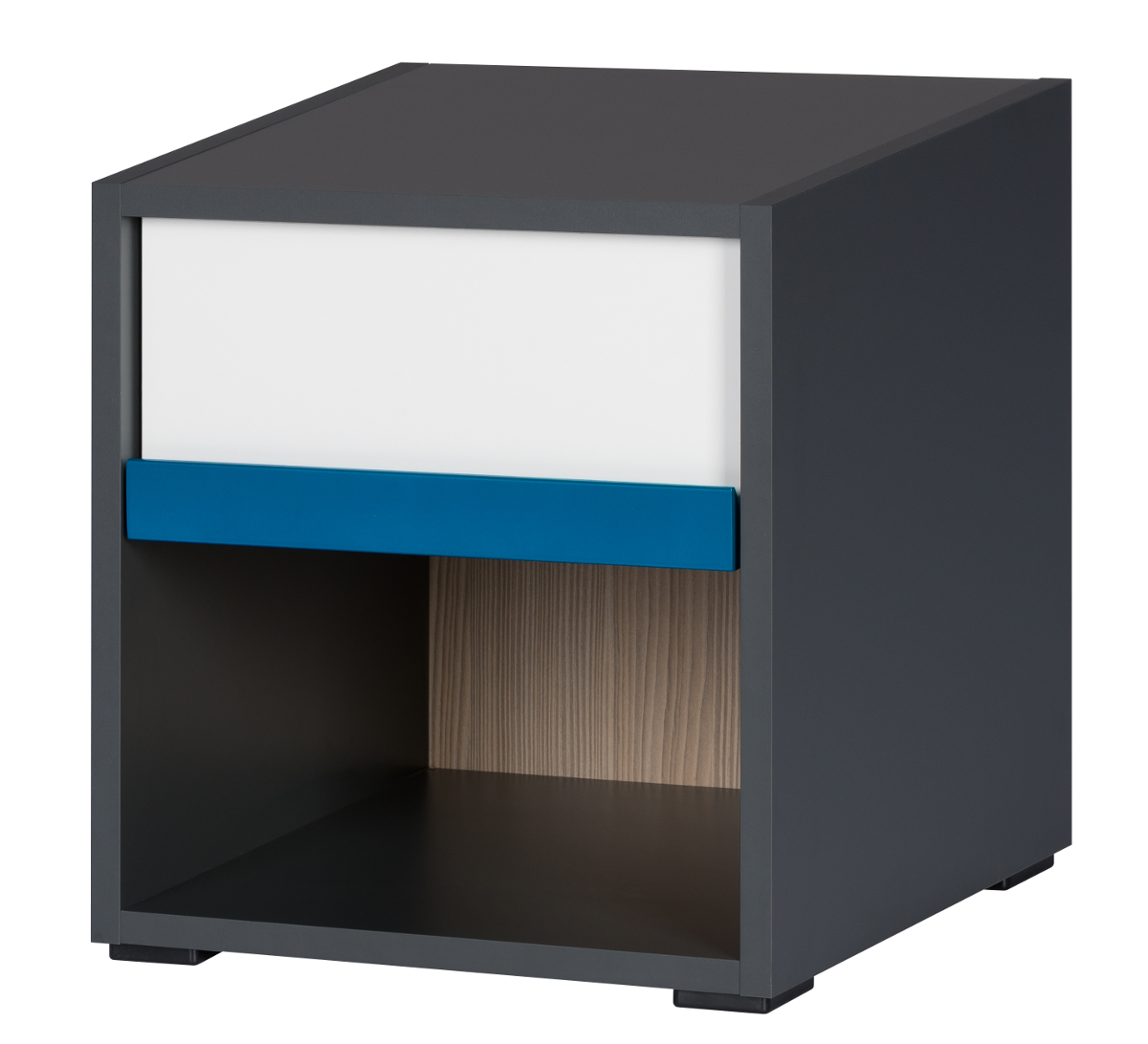 Dětský noční stolek Julien je ideální volbou nejen pro umístění do pokojíčku, ale také do studentského pokoje. Úložný prostor má podobu horní zásuvky a pod ní umístěné přihrádky, v níž se může zabydlet jak plyšový kamarád, tak rozečtené knížky. Kombinaci decentních odstínů bílá, grafit a borovice avola můžete (ale nemusíte) ozvláštnit zářivým odstínem výrazného podlouhlého úchytu, jenž si lze zvolit v tyrkysovém, fialovém, růžovém, limetkovém nebo grafitovém provedení.