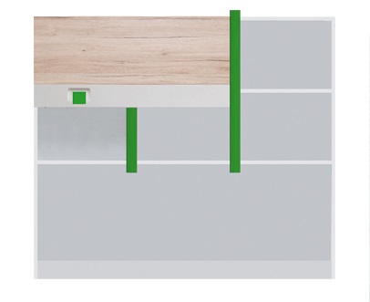 Zatímco korpus je vyveden v jednoduché bílé, tak přední část je kombinací přírodního dekoru dubu san remo, hedvábně bílé a zelené či růžové barvy. Svůj vzhled i barevnost si zachová po mnoho let díky na výrobu zvoleným LTD deskám. Ty se vyznačují dlouhou životností, vysokou stálostí a neměnným vzhledem. Výhodou je také nenáročná povrchová údržba.