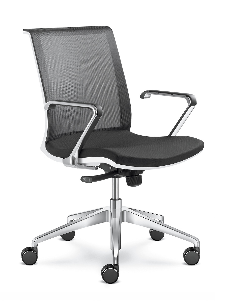 Zvolte si potah čalouněného sedáku z luxusní kůže, ekokůže nebo odolné látky. Všechny tyto materiály máte k dispozici ve více barvách. Opěradlo je potaženo samonosnou síťovinou v černém provedení, která vám zajistí pohodlné opření i osvěžující odpočinek v průběhu celého dne. Područky jsou kombinací hliníku a černého plastu. Pro tichý pohyb po kanceláři je kříž z leštěného hliníku opatřen pryžovými kolečky na tvrdé povrchy. Tmavé části jsou doplněny plastem v bílé barvě.