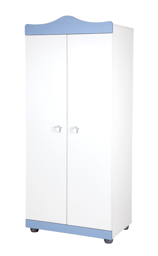 Skříň Ronie se hodí spíše do chlapeckého dětského pokoje už jenom pro svou barevnou kombinaci modré a bílé. Oplývá takovými doplňky jako úchytky dveří ve tvaru stříbrných korunek nebo zvláštní kulaté nožky.