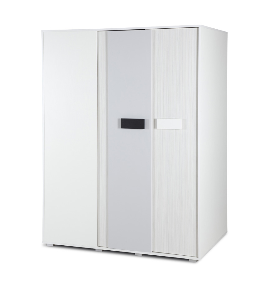 Velká šatní skříň Riki má vnitřní prostor rozdělen na dvě části. Vlevo je šatní tyč a tři police a vpravo najdete čtyři police k uložení prádla i pro dva sourozence. Styl jí dodává klasické zabarvení bílé borovice v kombinaci s šedou, což je typické pro celou kolekci.