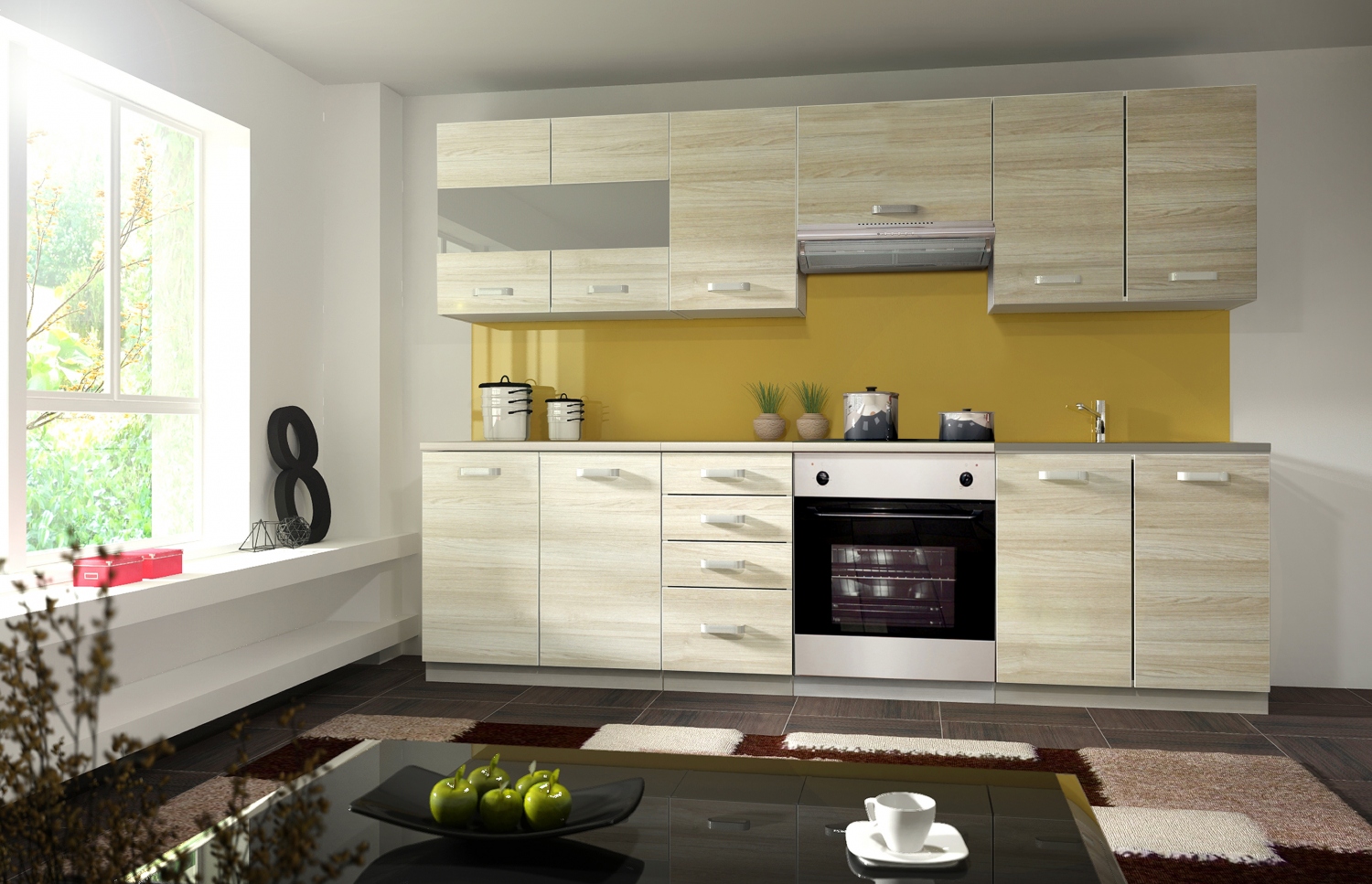 Jednotlivé komponenty jsou vyrobeny z materiálu vhodného do zátěžového prostředí, jakým kuchyně bezesporu je. Použité lamino činí nábytek odolným vůči vlhkosti i mechanickému poškození. Kromě toho vyniká barevnou stálostí a nenáročnou povrchovou údržbou. Vyobrazené dekorace, vodovodní baterie a kuchyňské spotřebiče nejsou zahrnuty v ceně sestavy.