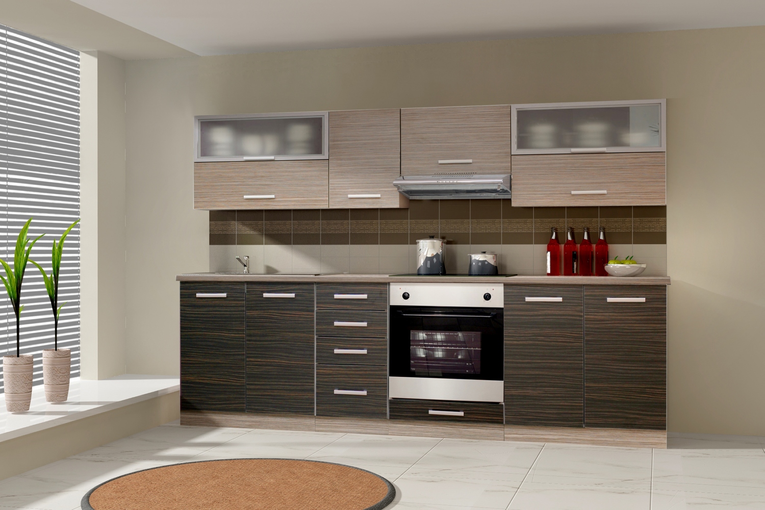 Elegantní kuchyňská linka zahrnuje osm kuchyňských skříněk – horních i dolních. Moderní žíhané provedení kombinuje několik odstínů hnědé, které spolu přirozeně ladí, a které napomohou k navození dojmu útulnosti.