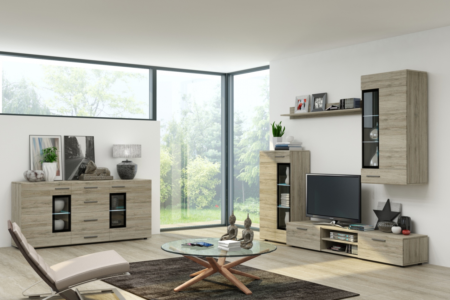 Sestava se skládá z velké prosklené komody a obývací stěny, jejíž součástí jsou klasická i závěsná vitrína, televizní stolek a police. Prosklené části je možné dovybavit stylovým LED osvětlením, které v interiéru vytvoří zajímavou večerní atmosféru. Výrobním materiálem je odolné lamino v přírodním dekoru dub san remo tmavý, který doplňují černé rámy skel.