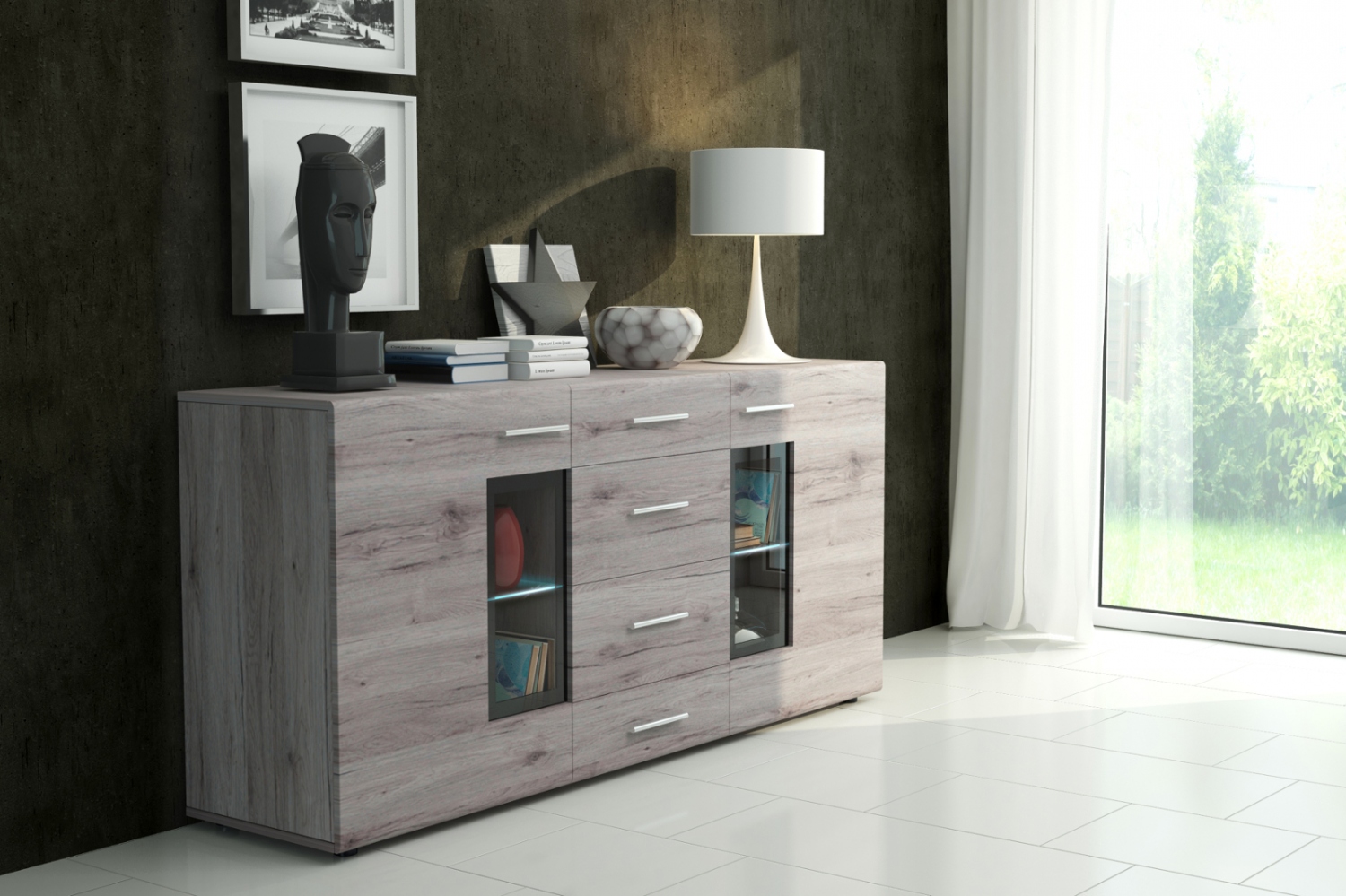 Komoda obsahuje dvě boční skříňky s částečně prosklenými dvířky a čtyři šuplíky na drobnosti a doklady. Ke komodě doporučujeme pořídit moderní LED osvětlení prosklených částí, které zvýrazní vystavené předměty a navíc v interiéru vytvoří nový zdroj světla. Na výrobu komody bylo použito zákazníky velmi oblíbené lamino.