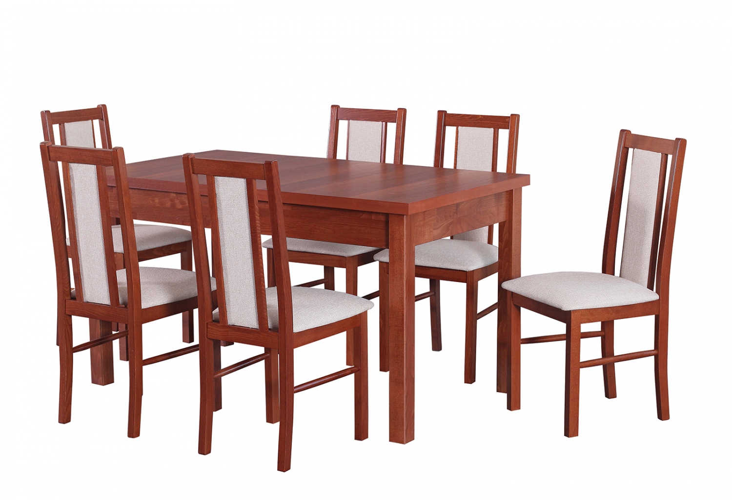 Jídelní set Darius je díky preciznímu zpracování vhodný nejen do domácnosti, ale také do restauračních zařízení, kde jsou na tento nábytek kladeny mnohem větší nároky. Sestava zahrnuje rozkládací jídelní stůl a šest čalouněných židlí.