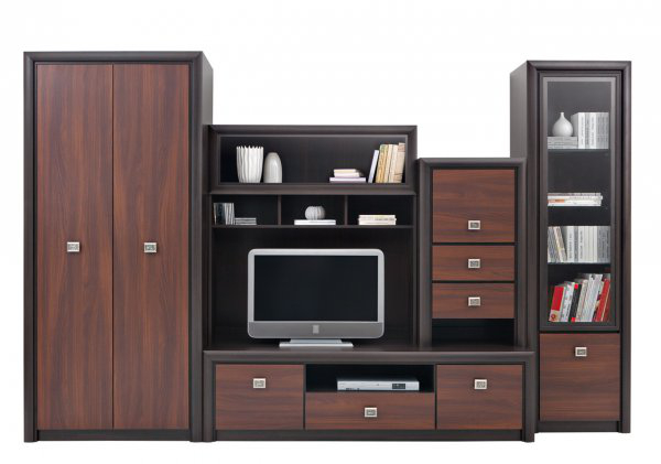 Obývací stěna Stoklar je v několika barevných kombinacích. Nabízí otevřený prostor, šuplíky, vitrínu i skříň.