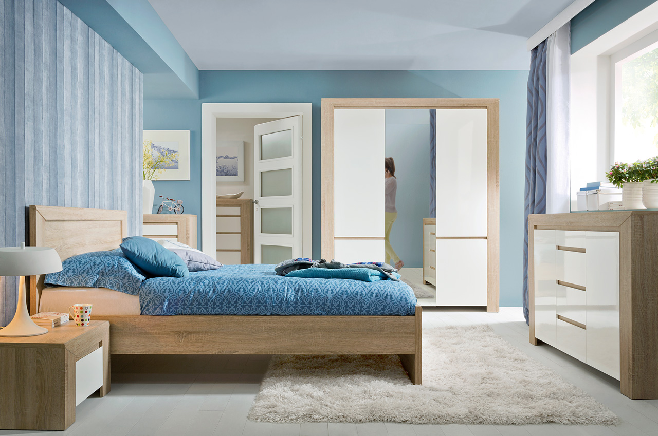 Materiál komponentů je z LTD + MDF.Barevné provedení dub sonoma nebo dub sonoma / bílý lesk.Postel je dodávána bez matrace a roštu, možnost doobjednání.