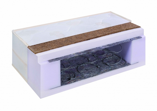 Jádro z bonellových pružin je dvoustranně obloženo tvrdou textilií, která zabraňuje poškození pěny T-25 o tlošťce 20 mm a jednostranně vrstveno kokosovou vycpávkou.
