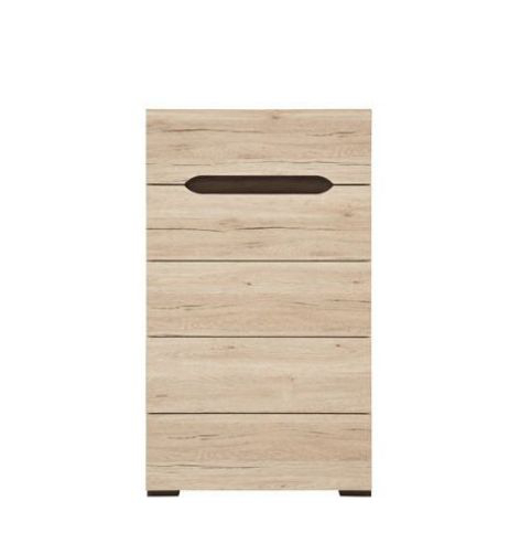 Komoda je vyrobena z lamina, jehož povrchová úprava je v dekoru dub san remo světlý, který svým vzhledem vaši domácnost zútulní a zateplí. Zdobný prvek v provedení dub wenge hnědý její vzhled příjemně oživí.